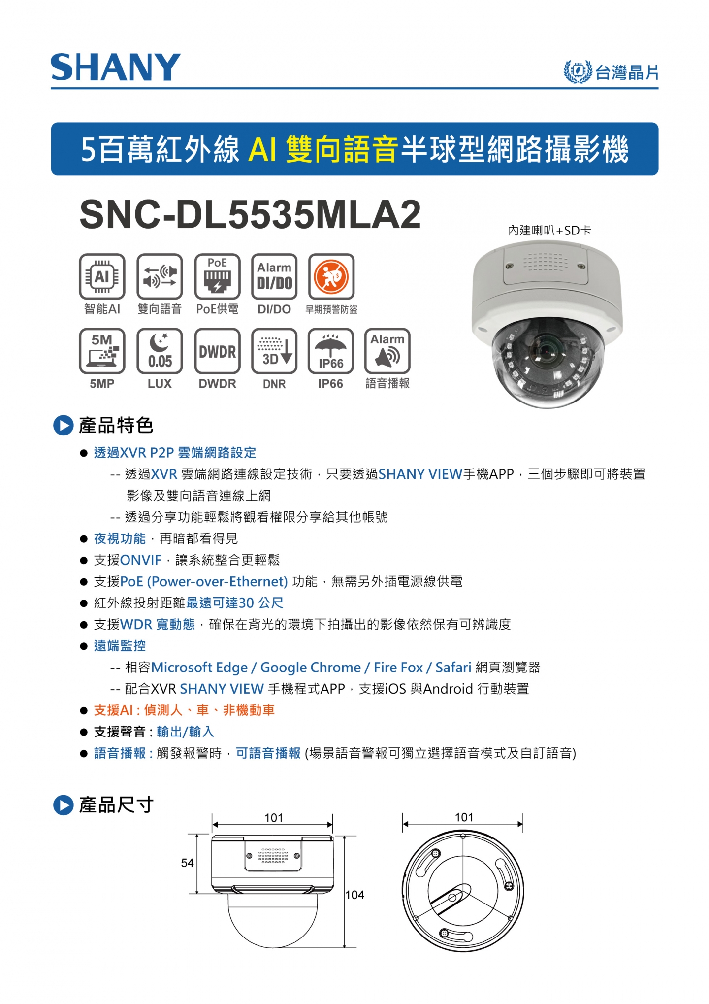 5百萬紅外線AI雙向語音半球型網路攝影機 (型號: SNC-DL5535MLA2 )