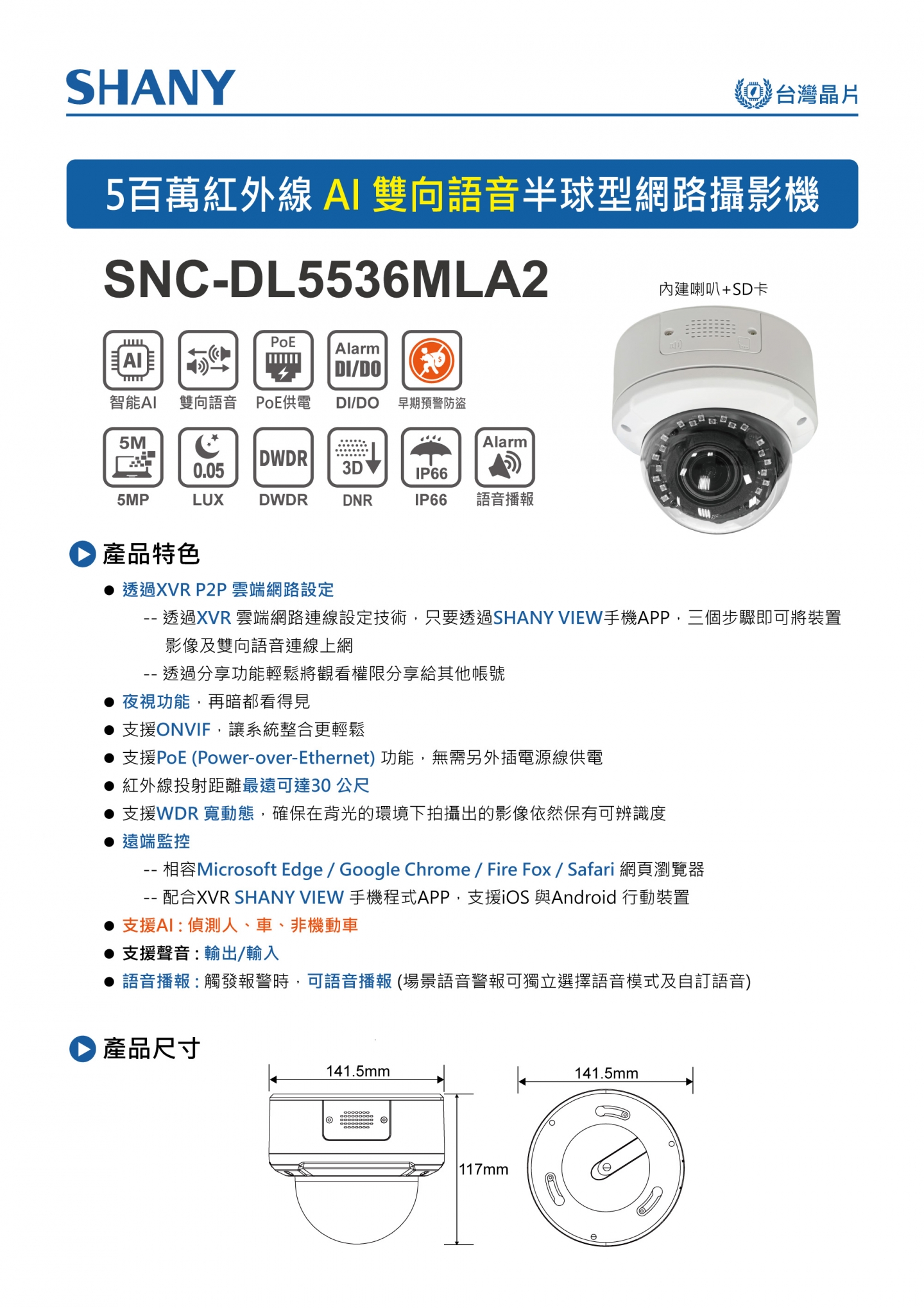 5百萬紅外線AI雙向語音半球型網路攝影機 (型號: SNC-DL5536MLA2)