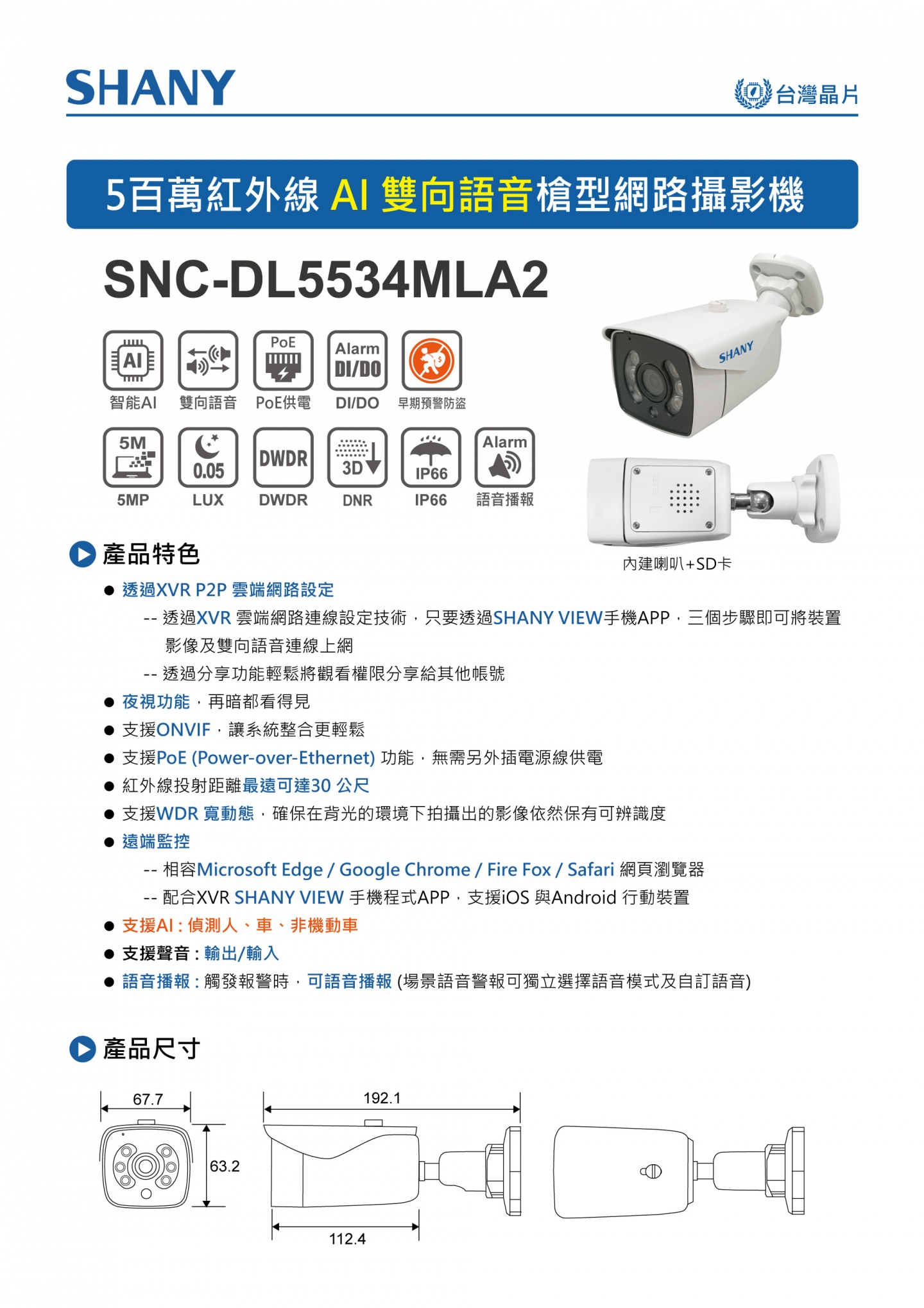 5百萬紅外線AI雙向語音槍型網路攝影機 (型號: SNC-DL5521MLA2 )