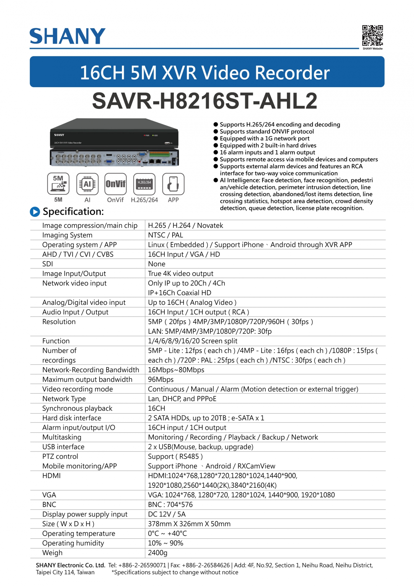 16CH 5M XVR Video Recorder ( Model: SAVR-H8216ST-AHL2 )