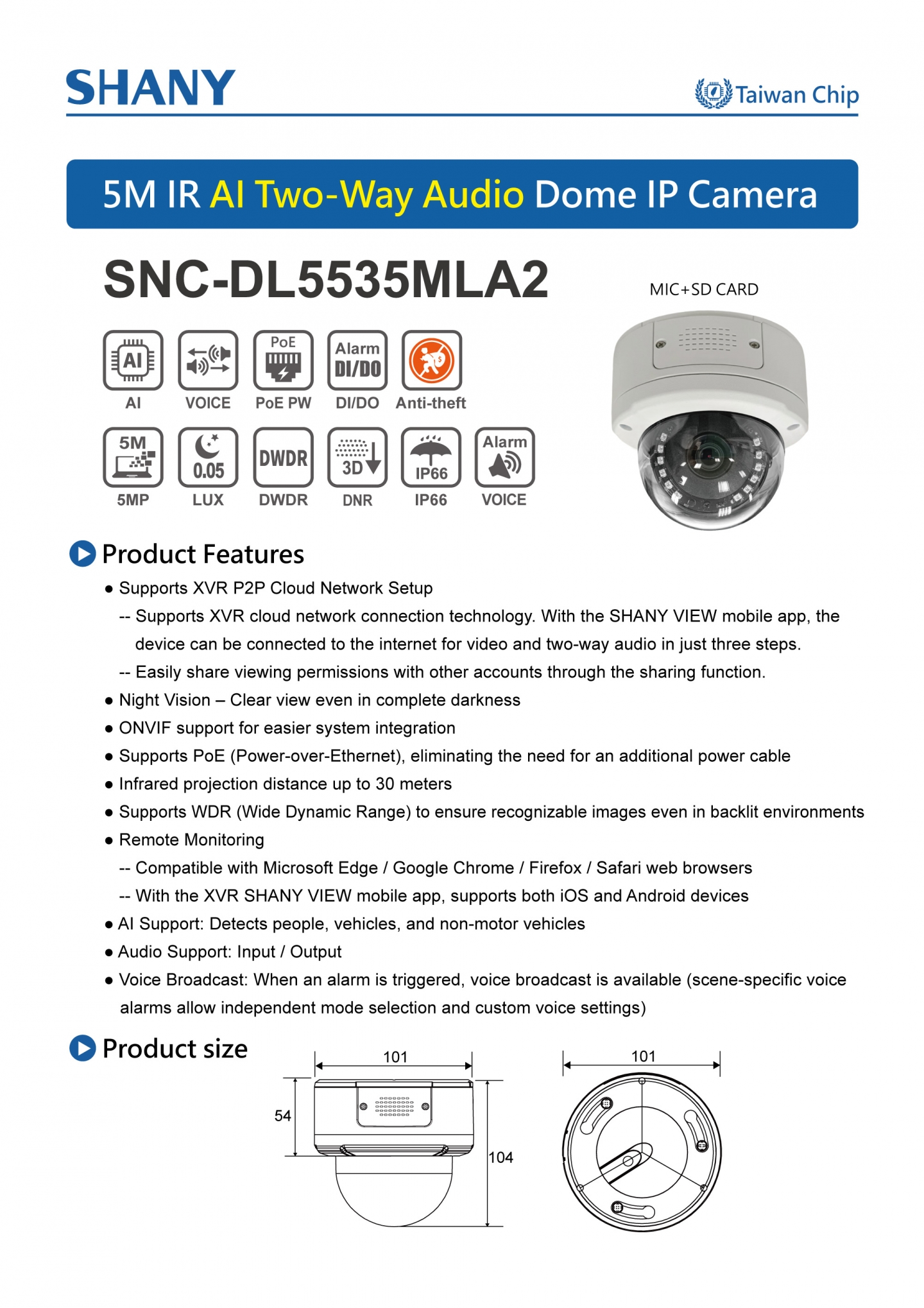 5M Two-Way Audio IR Dome IP Camera (Model: SNC-DL5535MLA2)
