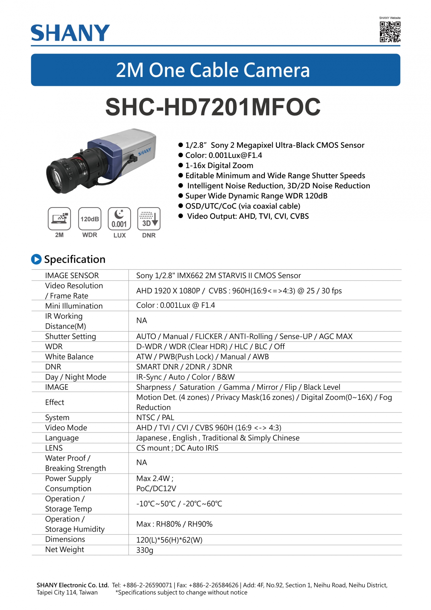 2M HD One Cable Camera ( Model : SHC-HD7201MFOC )