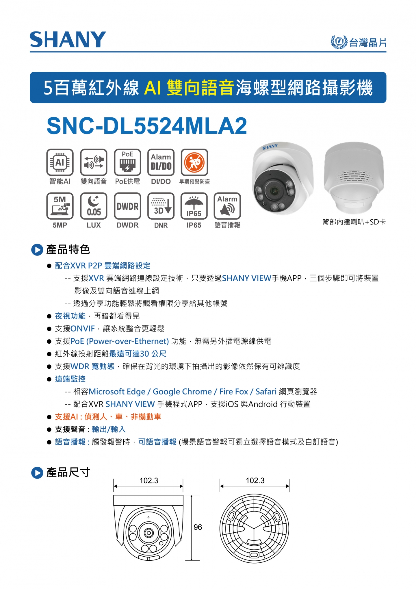 5百萬紅外線 AI 雙向語音海螺型網路攝影機 (型號: SNC-HDL5524MLA2)