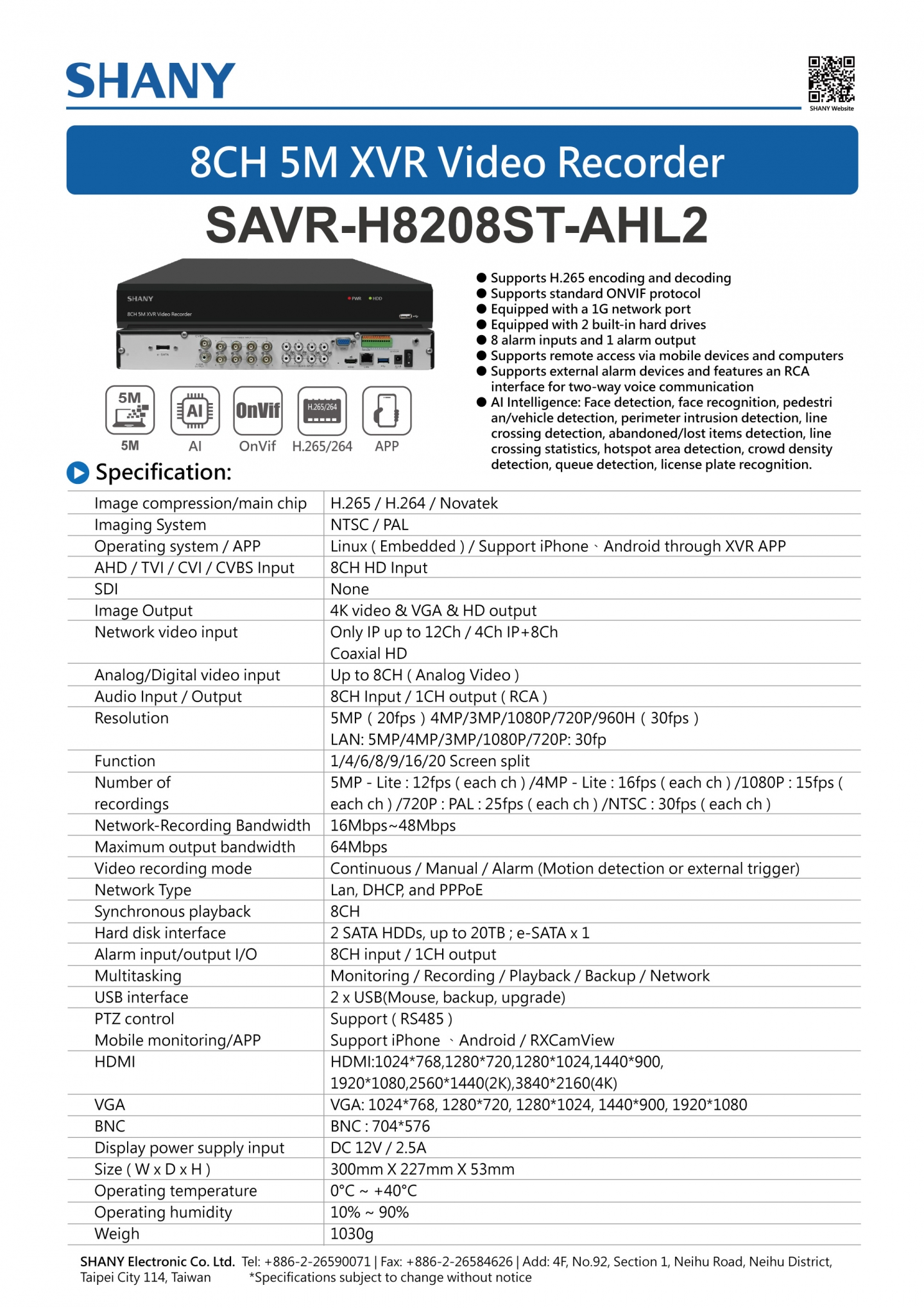 8CH 5M XVR Video Recorder ( Model : SAVR-H8208ST-AHL2 )