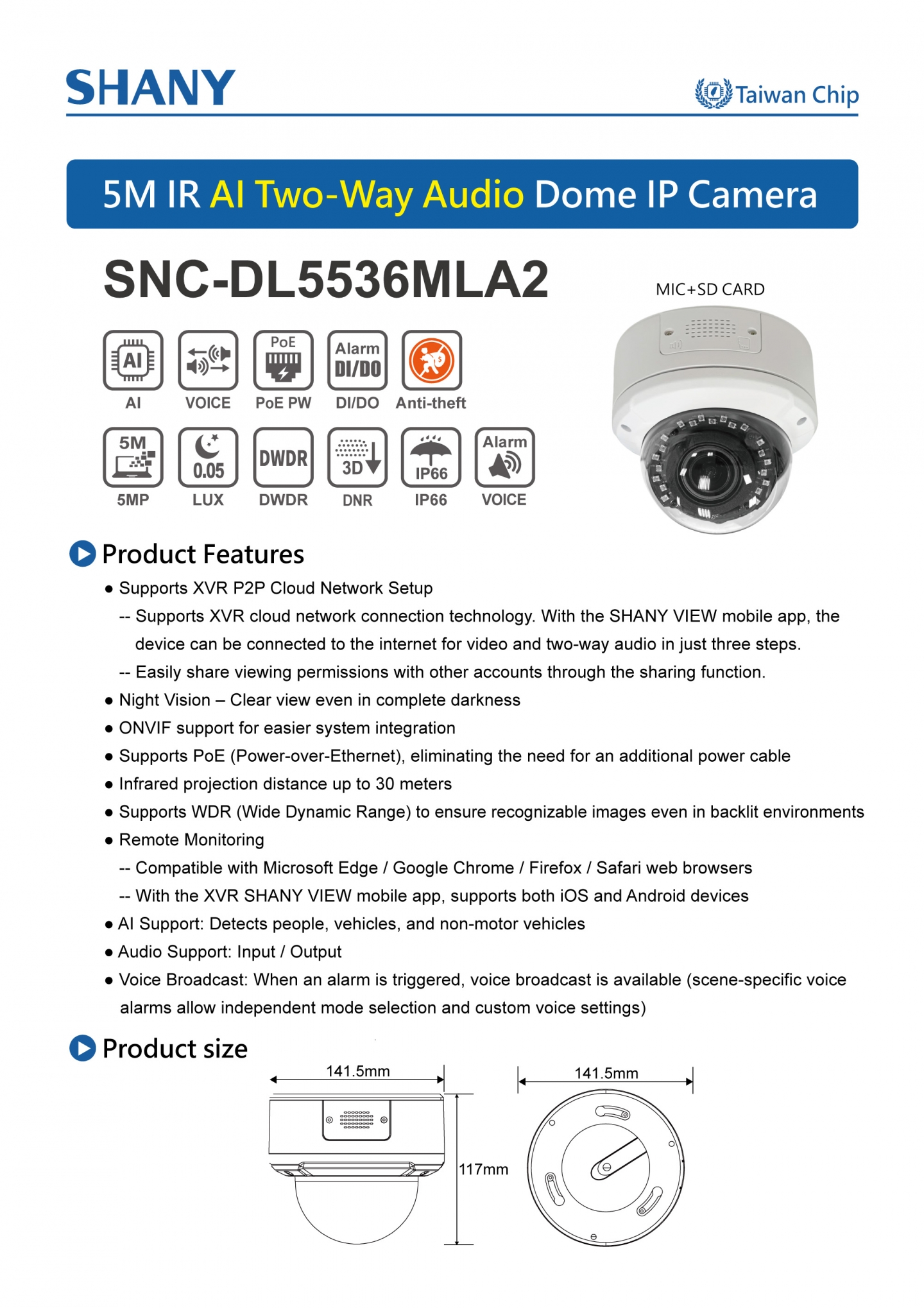 5M Two-Way Audio IR Dome IP Camera (Model: SNC-DL5536MLA2)