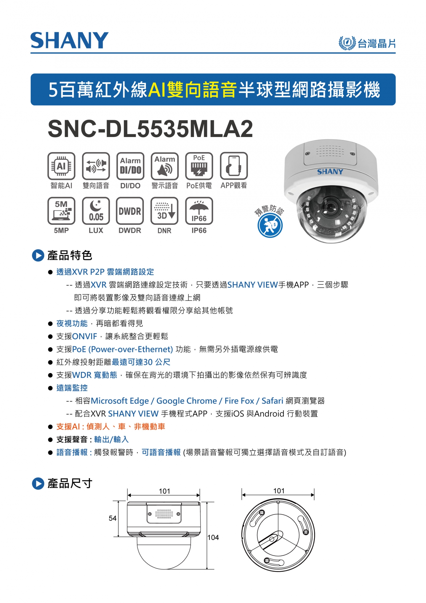 5百萬紅外線AI雙向語音半球型網路攝影機 (型號: SNC-DL5535MLA2 )
