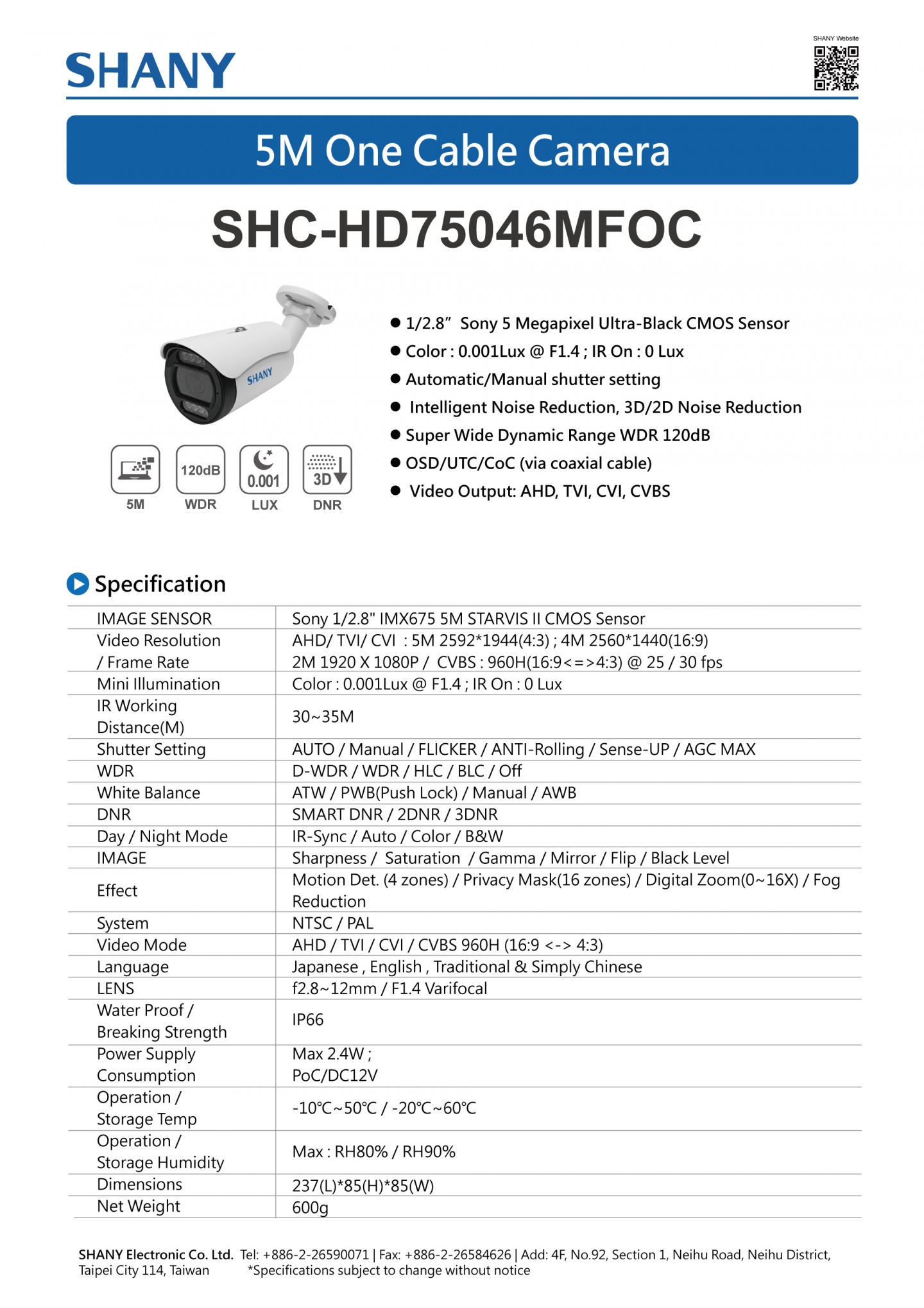 5M HD One Cable Camera ( Model : SHC-HD75046MFOC )